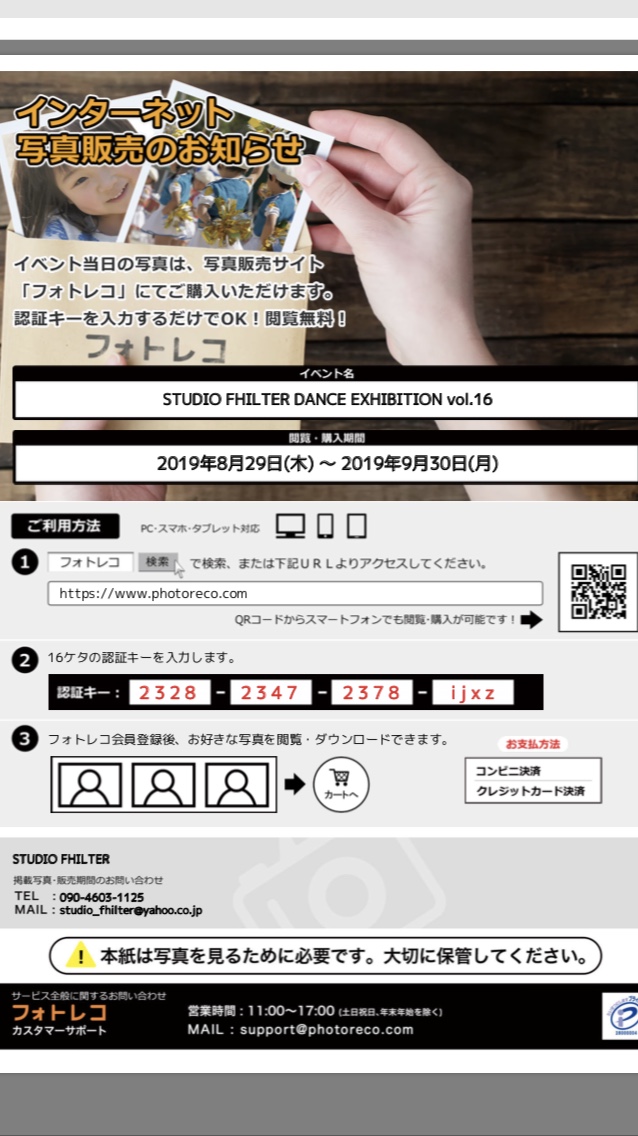 2019.08.30 | その他のお知らせ 発表会スチール販売開始 先日行われました、STUDIO FHILTER DANCE EXHIBITION vol.16の、スチール販売が開始となりました。 写真販売はもちろん、携帯画像ファイルとしても購入が可能です。 皆様が購入しやすい様に安価にて設定してありますので、思い出の1枚を是非ご購入下さい。 尚、販売期間がございますから、お買い求め希望の方はお早めにご購入下さいね!! 【販売期間】 2019年8月29日(木)~2019年9月30日(月) 【購入方法】 画像をご参照頂き、フォトレコのサイトから直接欲しい画像をご購入下さい。 前ページ 次ページ BLOG一覧へ戻る Category インストラクター LESSON動画 印西千葉ニュータウン校について キャンペーン・NEWレッスン情報!! コンテスト結果・イベント情報 2025年度クローズクラス(満員)のお知らせ その他のお知らせ ママクラスのお知らせ 休講・代講のお知らせ 体験・見学予約方法について 体験レッスンに必要なお持物 感染拡大防止の取り組みについて 振替・新規入会NGクラスのお知らせ New Article 2025.05.24 ALL DANCE SOLO CONTEST ONLINE 結果報告 2025.05.24 DoMyBest DANCE CONTEST 結果報告 2025.05.23 【柏本校】KANAKO先生 HIPHOP初・中級class LESSON動画 2025.05.23 【柏本校】静空先生 HIPHOP 初級 class LESSON動画 2025.05.21 【柏本校】Noa先生 HOUSE 入門・初級 Kids&Jr class LESSON動画