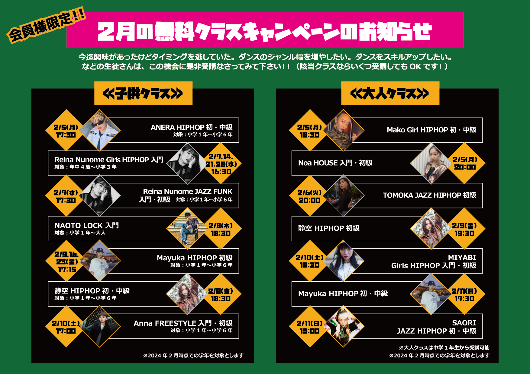 2024.01.15 | キャンペーン・NEWレッスン情報!! 会員様限定!!2月キャンペーンのお知らせ 【2月会員様限定キャンペーンのお知らせ】会員様であれば画像内の日程のクラスは、何回受講しても無料となります。この機会に、新たな自分と出会ってみませんか??皆様、お待ちしております🙇🙇 前ページ 次ページ BLOG一覧へ戻る Category インストラクター LESSON動画 印西千葉ニュータウン校について キャンペーン・NEWレッスン情報!! コンテスト結果・イベント情報 2025年度クローズクラス(満員)のお知らせ その他のお知らせ ママクラスのお知らせ 休講・代講のお知らせ 体験・見学予約方法について 体験レッスンに必要なお持物 感染拡大防止の取り組みについて 振替・新規入会NGクラスのお知らせ New Article 2025.05.24 ALL DANCE SOLO CONTEST ONLINE 結果報告 2025.05.24 DoMyBest DANCE CONTEST 結果報告 2025.05.23 【柏本校】KANAKO先生 HIPHOP初・中級class LESSON動画 2025.05.23 【柏本校】静空先生 HIPHOP 初級 class LESSON動画 2025.05.21 【柏本校】Noa先生 HOUSE 入門・初級 Kids&Jr class LESSON動画