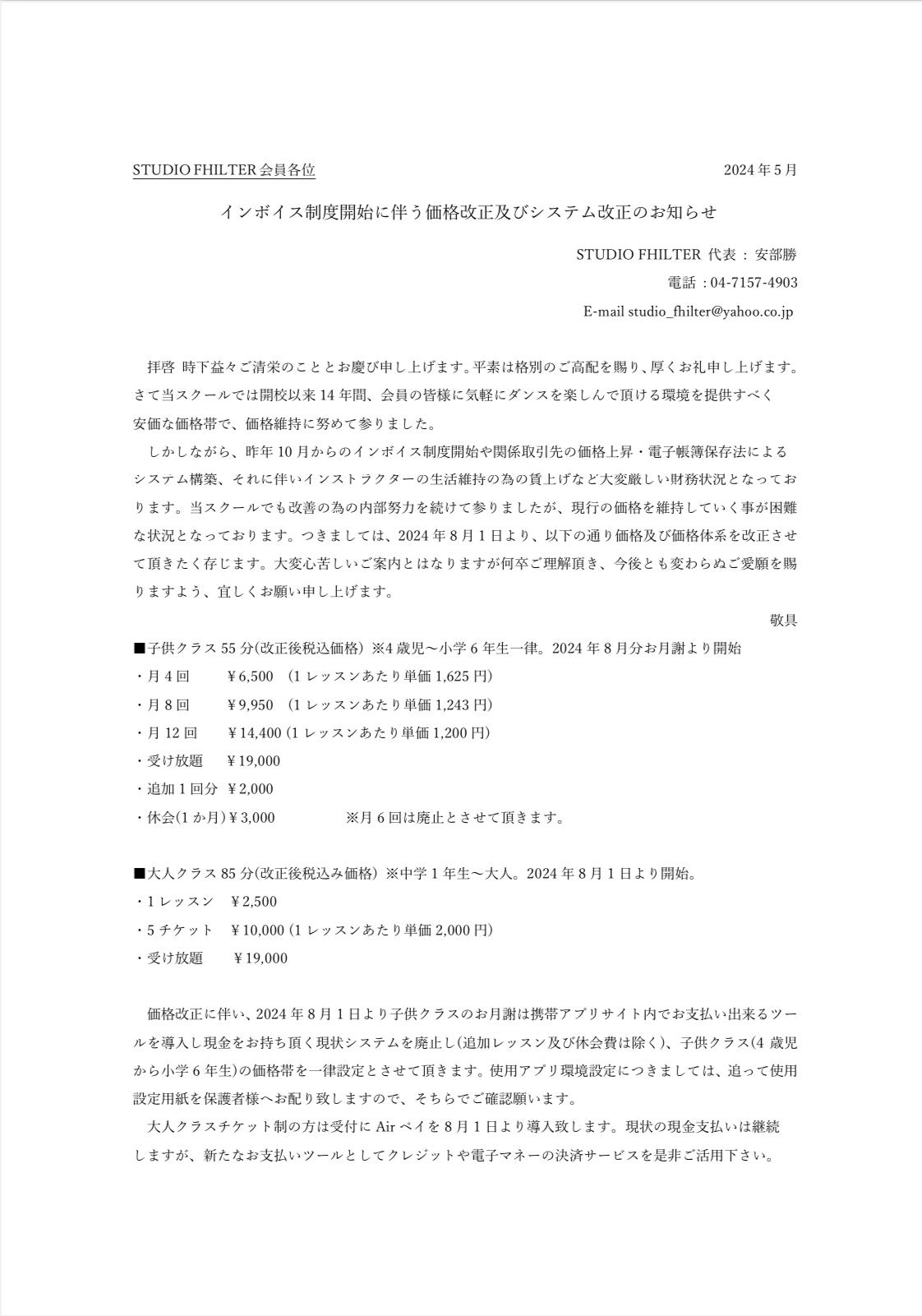 2024.05.20 | その他のお知らせ 価格及びシステム改正のお知らせ(2024年8月開始) 前ページ 次ページ BLOG一覧へ戻る Category インストラクター LESSON動画 印西千葉ニュータウン校について キャンペーン・NEWレッスン情報!! コンテスト結果・イベント情報 2025年度クローズクラス(満員)のお知らせ その他のお知らせ ママクラスのお知らせ 休講・代講のお知らせ 体験・見学予約方法について 体験レッスンに必要なお持物 感染拡大防止の取り組みについて 振替・新規入会NGクラスのお知らせ New Article 2025.05.24 ALL DANCE SOLO CONTEST ONLINE 結果報告 2025.05.24 DoMyBest DANCE CONTEST 結果報告 2025.05.23 【柏本校】KANAKO先生 HIPHOP初・中級class LESSON動画 2025.05.23 【柏本校】静空先生 HIPHOP 初級 class LESSON動画 2025.05.21 【柏本校】Noa先生 HOUSE 入門・初級 Kids&Jr class LESSON動画