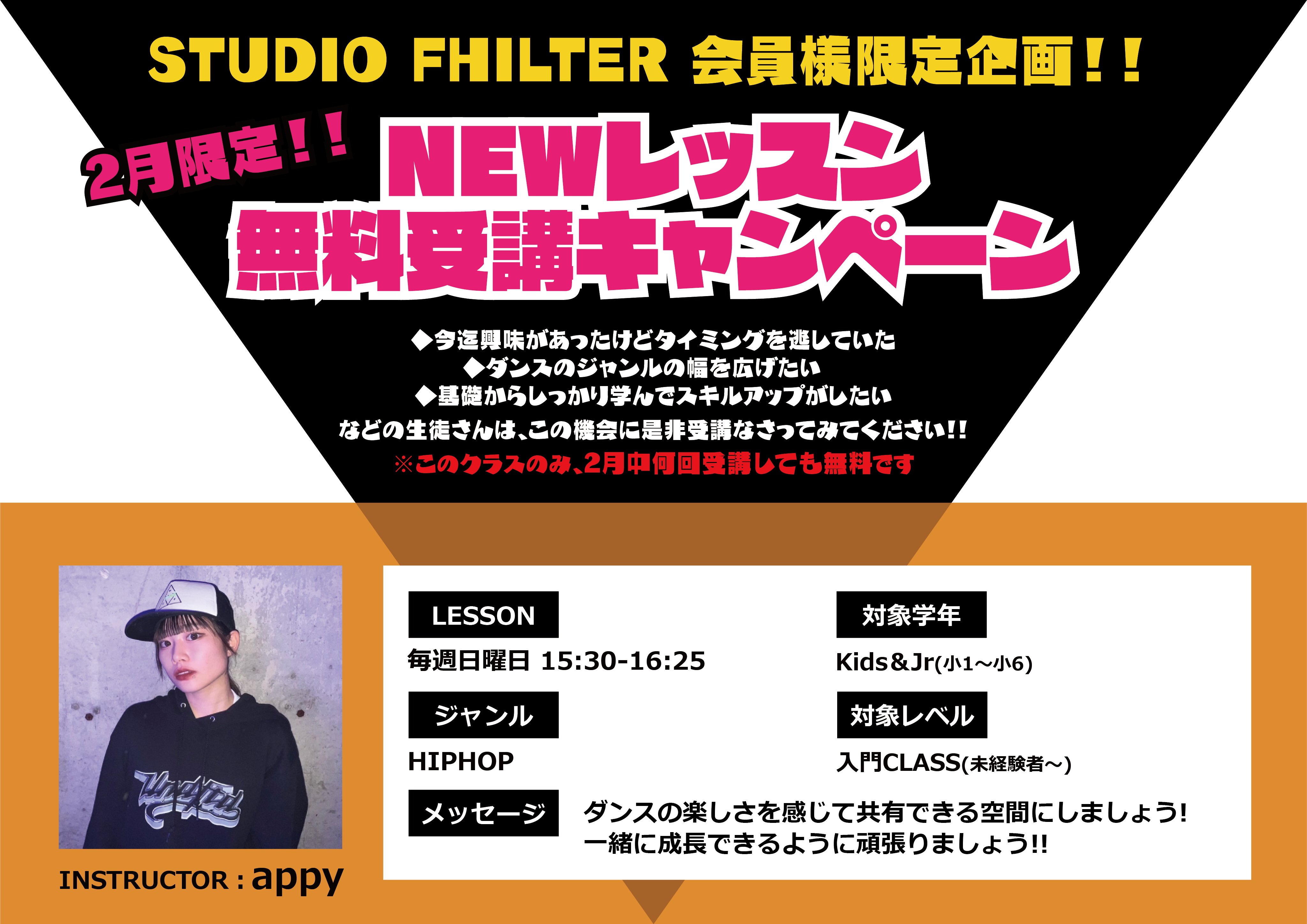 さらに会員様限定で、appy先生のクラスのみ2月中は何回受講してもレッスン料無料となります。